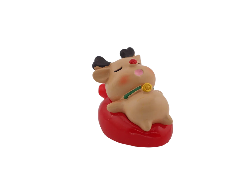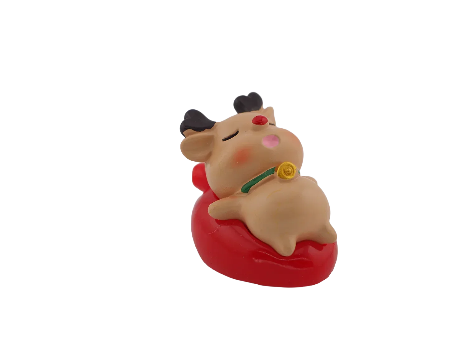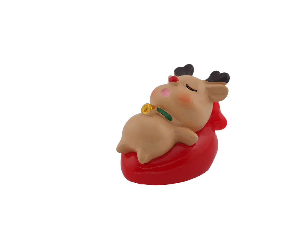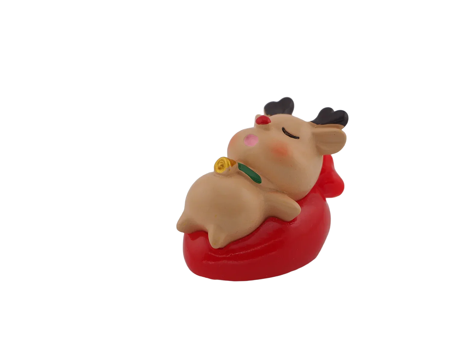 This reindeer rests peacefully on a bright red bag of gifts. Perfect for cozy winter scenes.