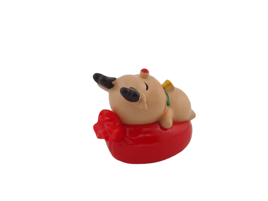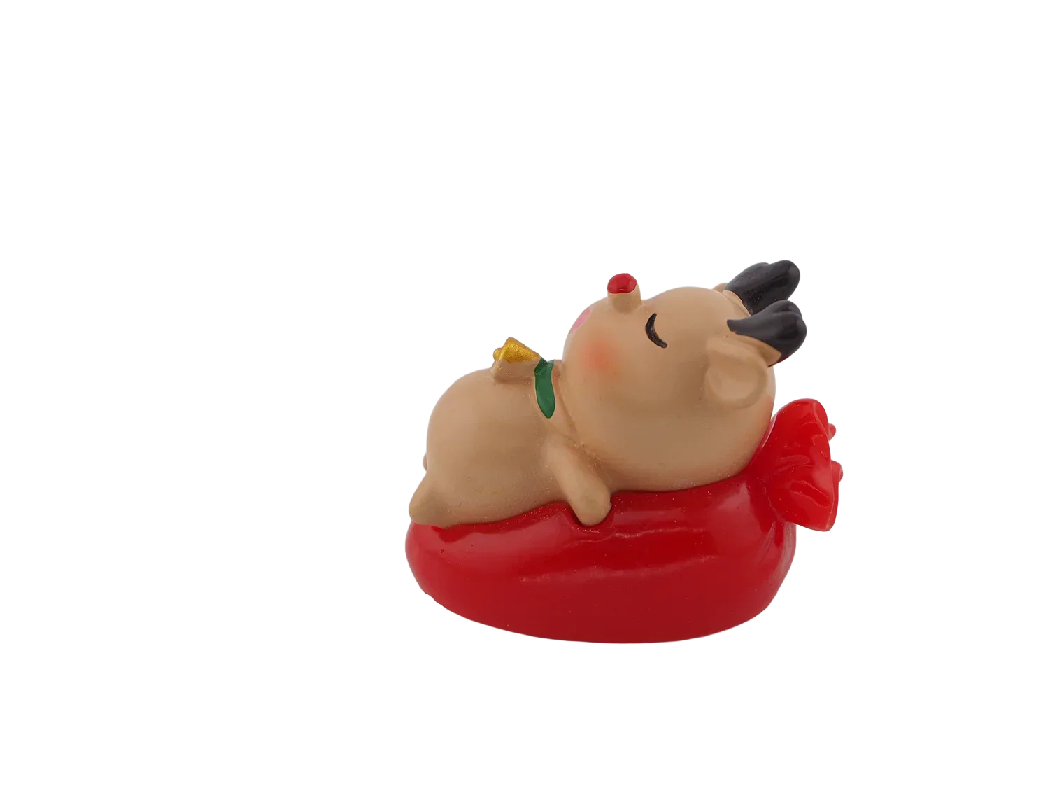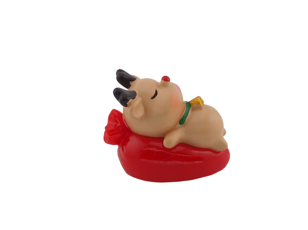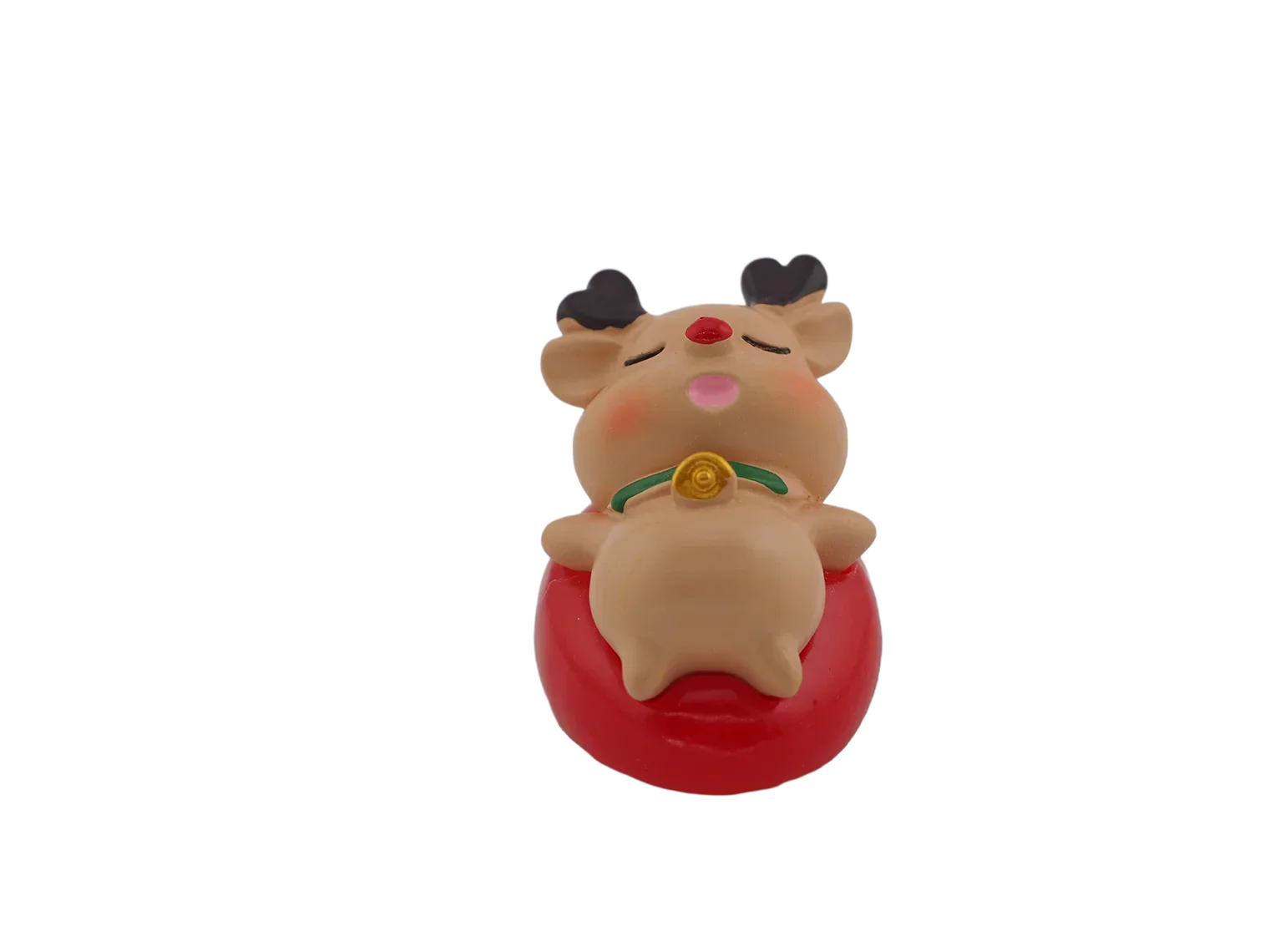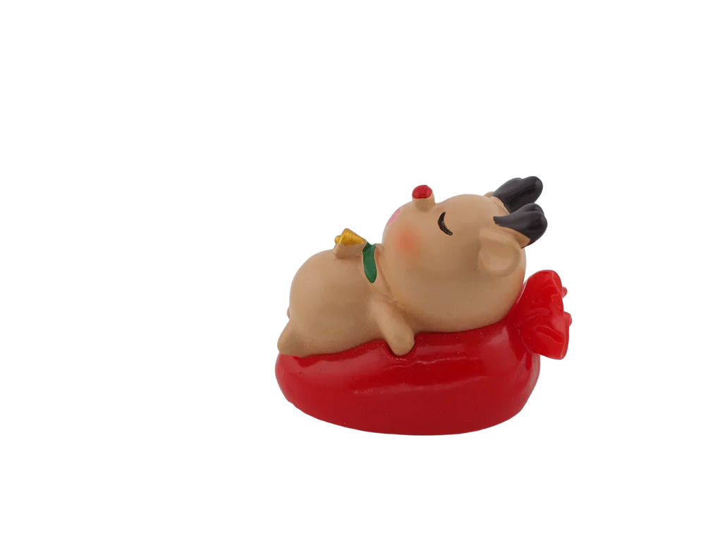 This reindeer rests peacefully on a bright red bag of gifts. Perfect for cozy winter scenes.