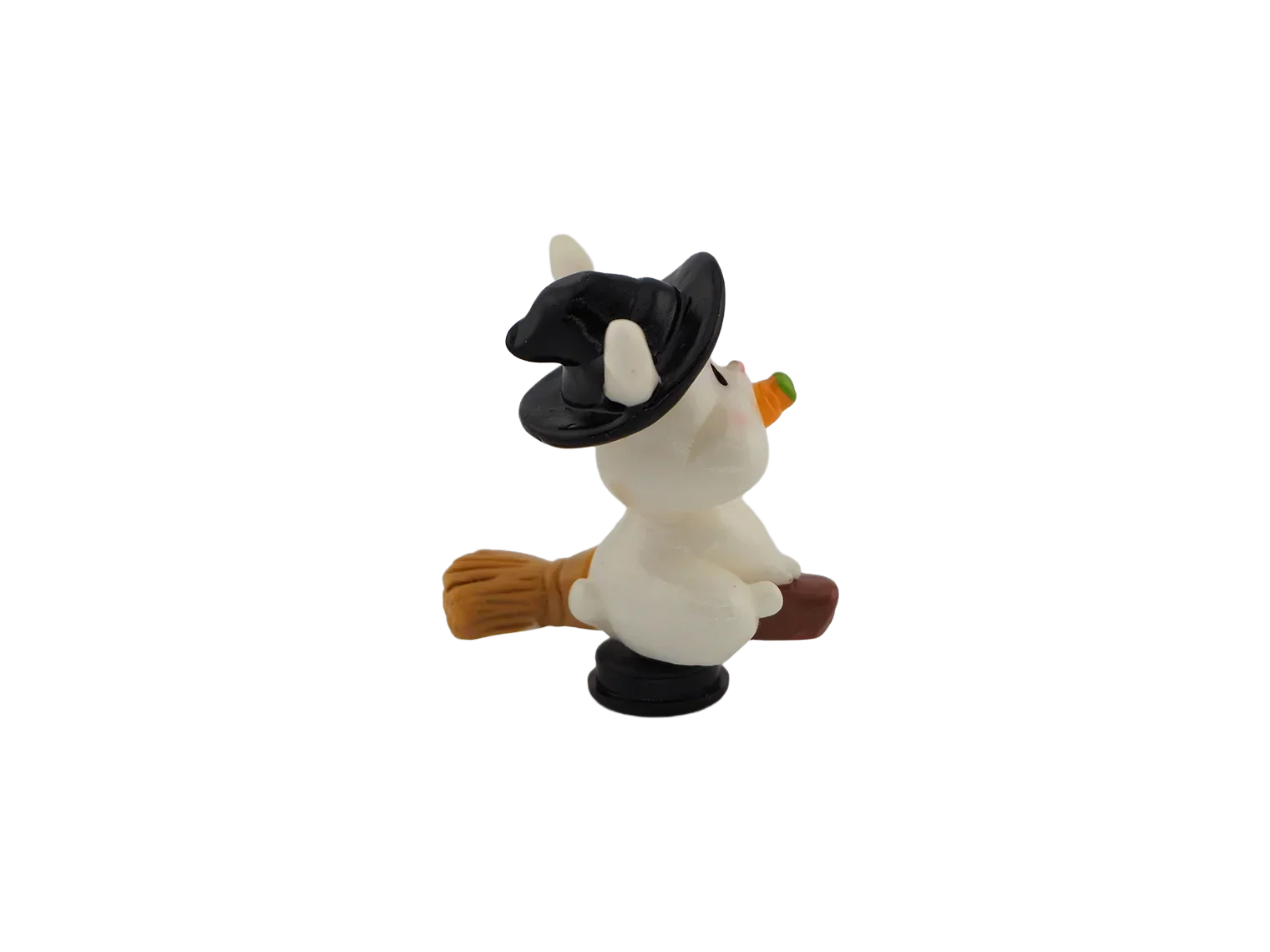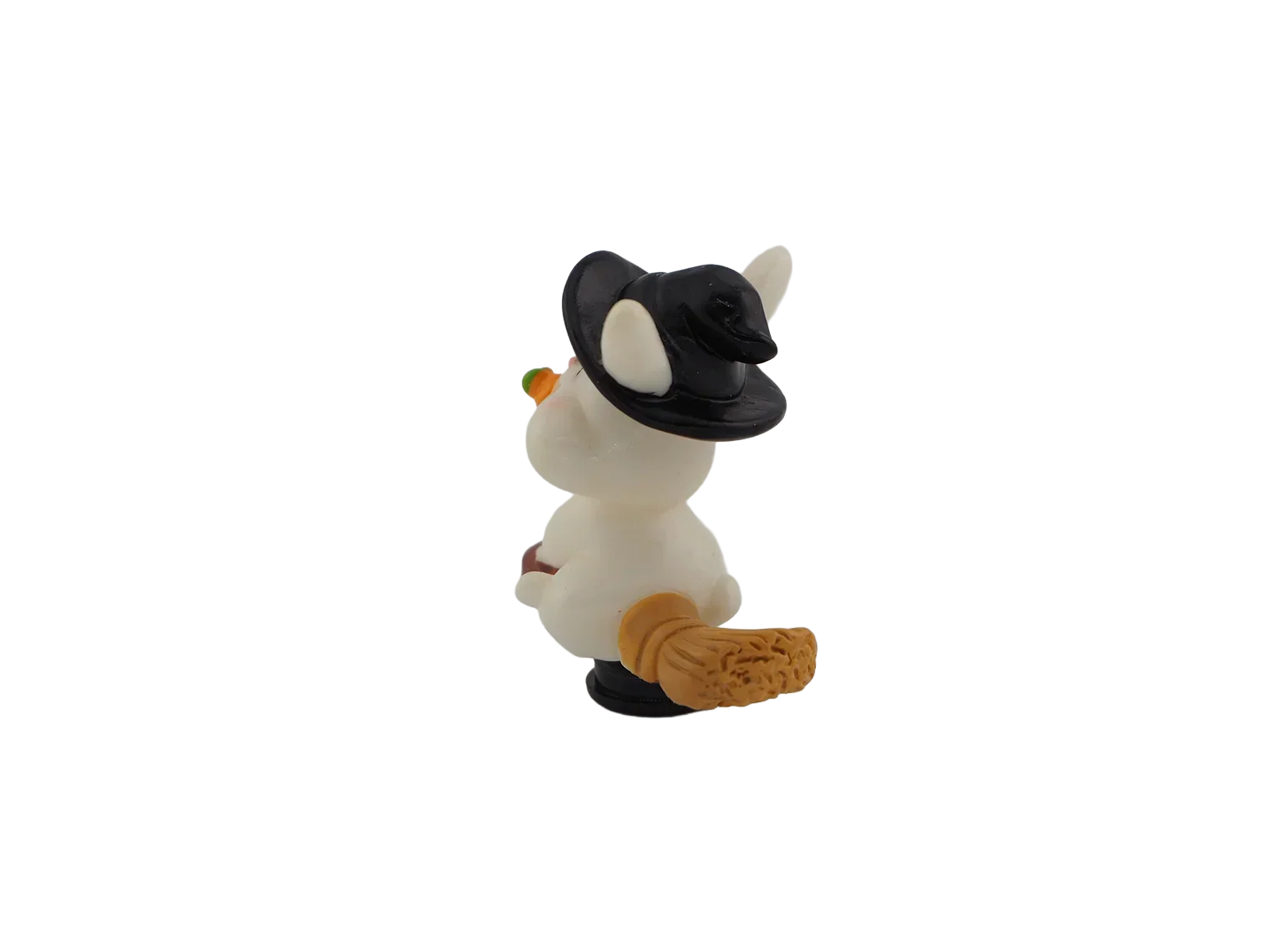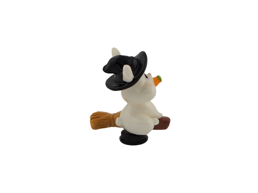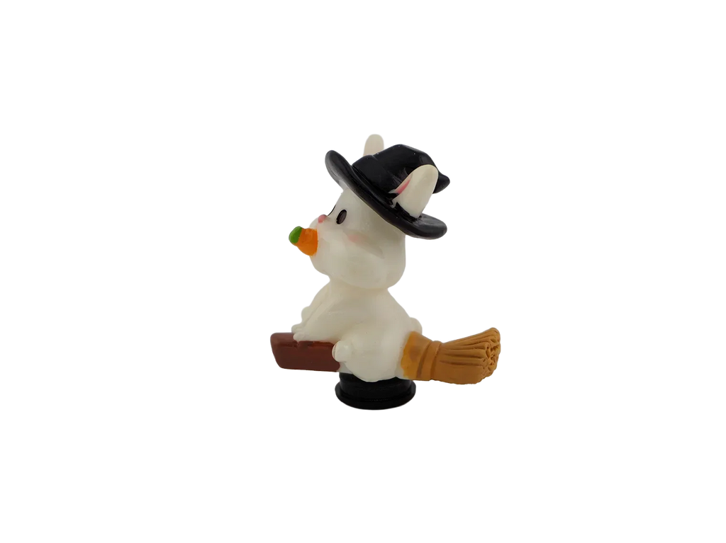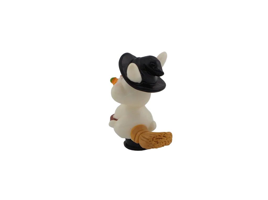 A bunny holding a carrot while wearing a witch hat. Adds whimsical Halloween fun to your décor.