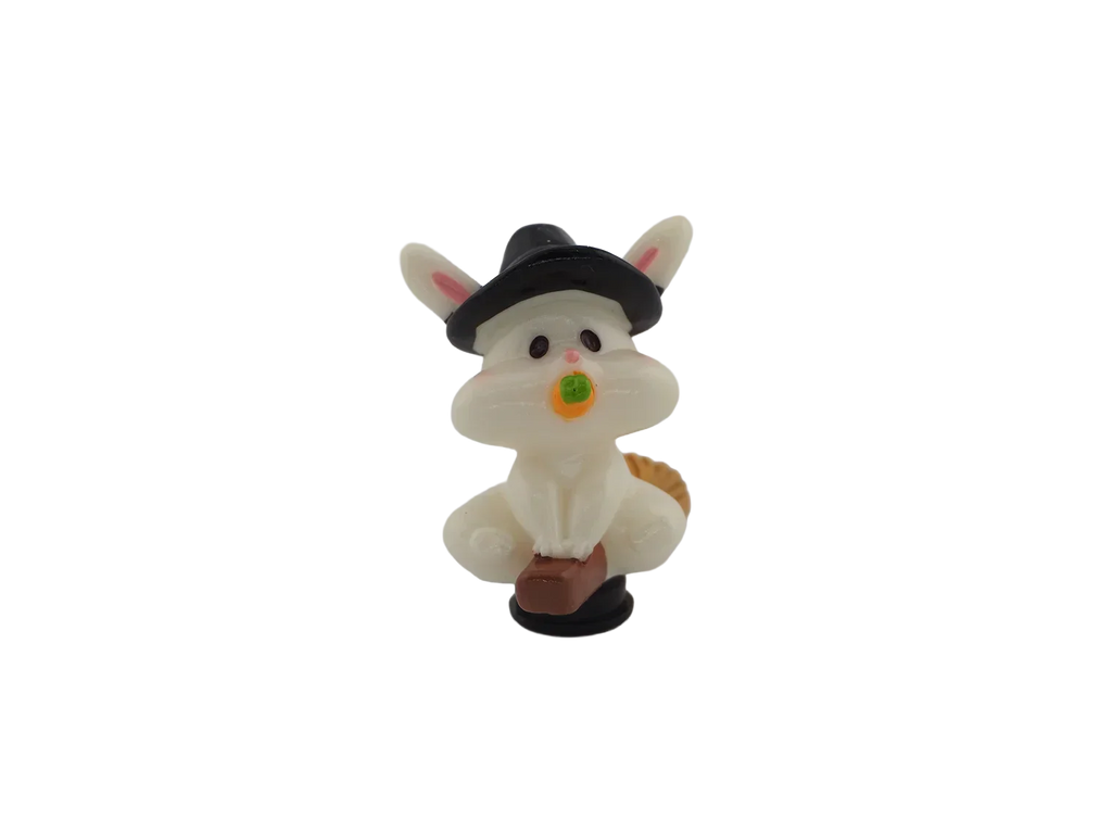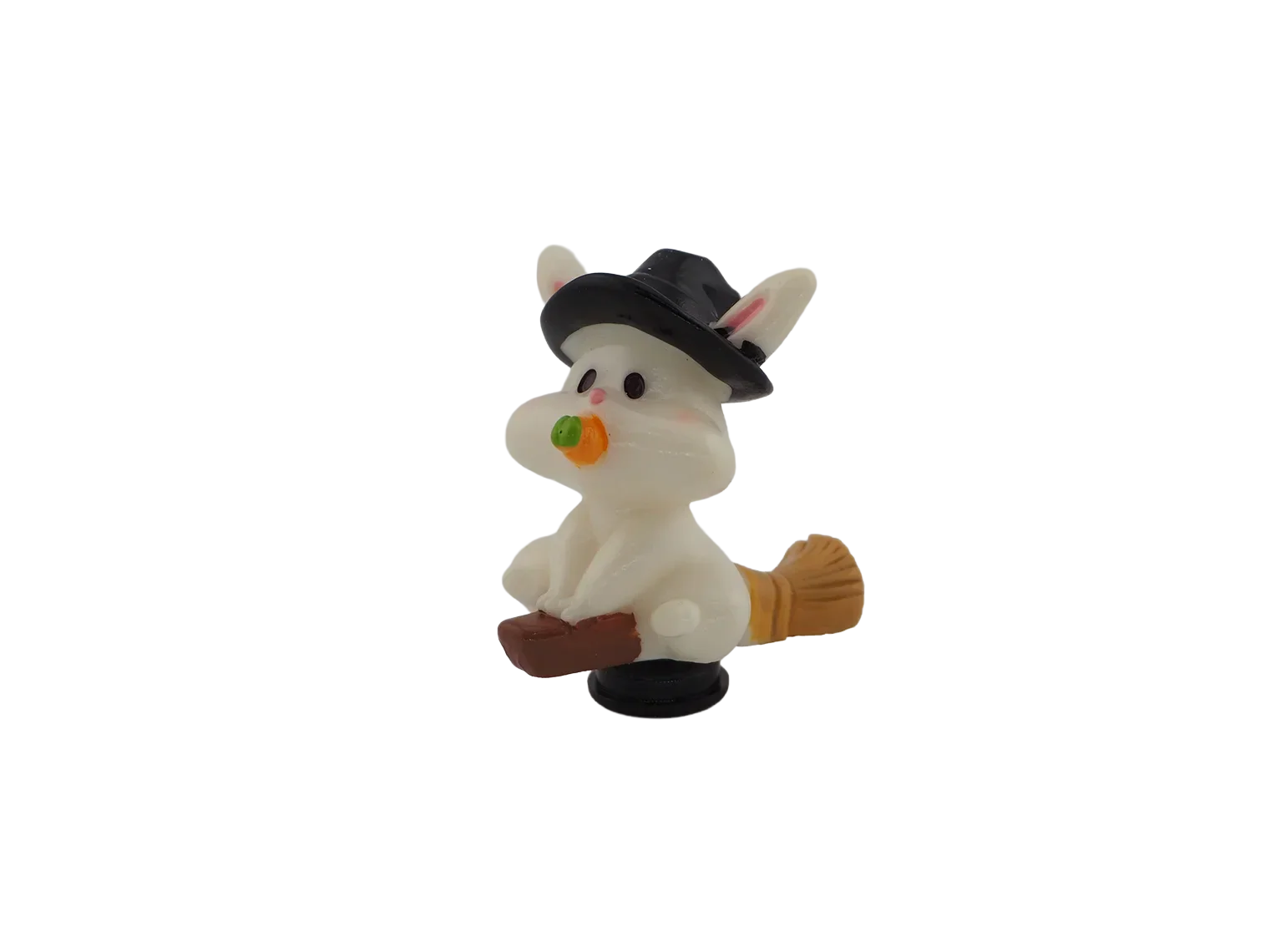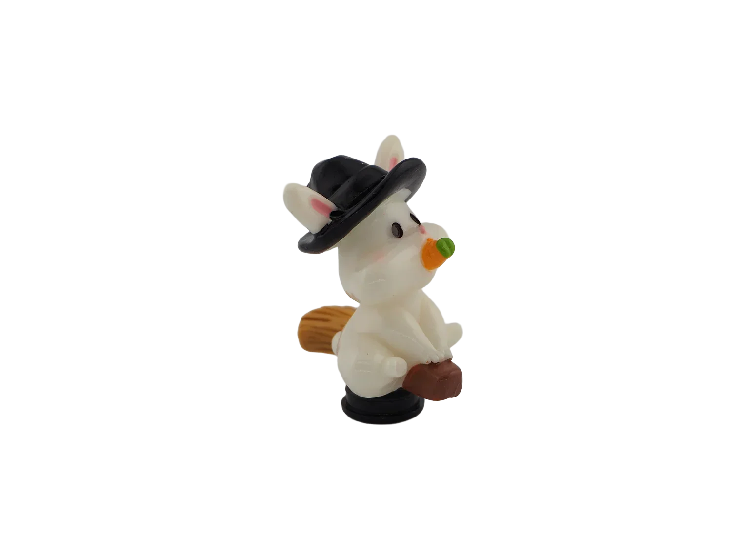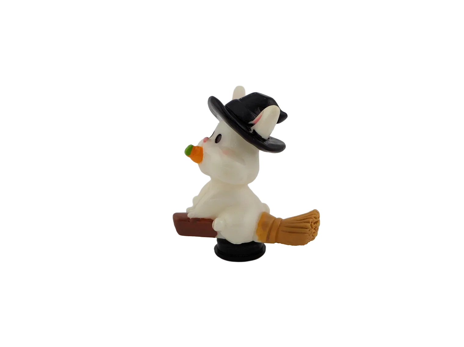 A bunny holding a carrot while wearing a witch hat. Adds whimsical Halloween fun to your décor.