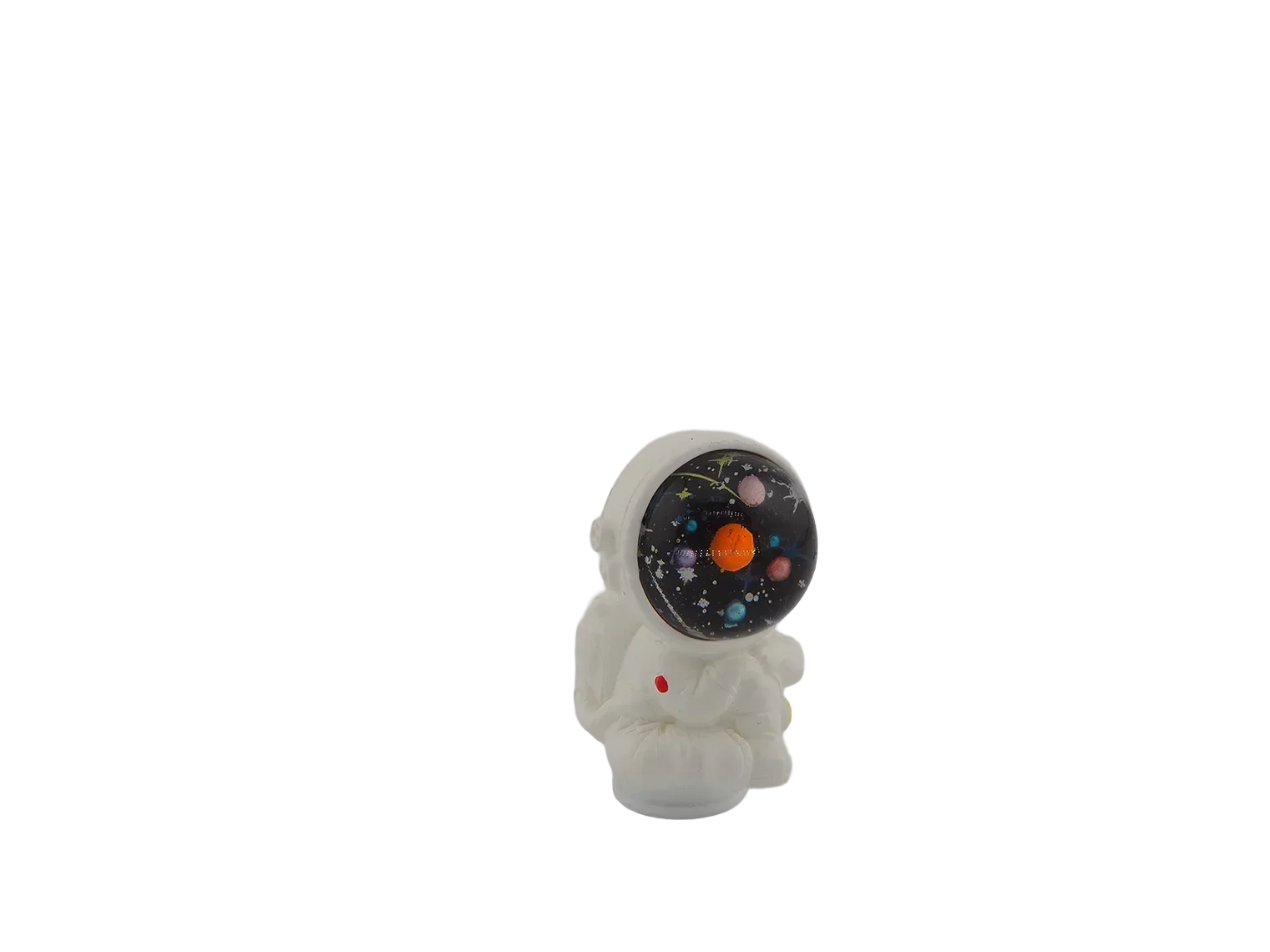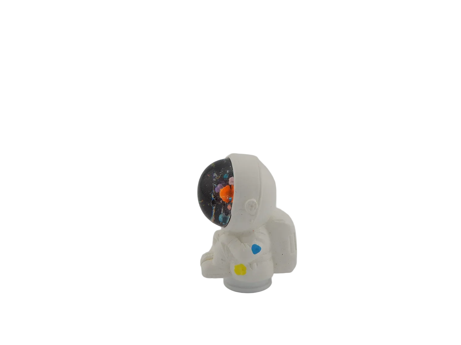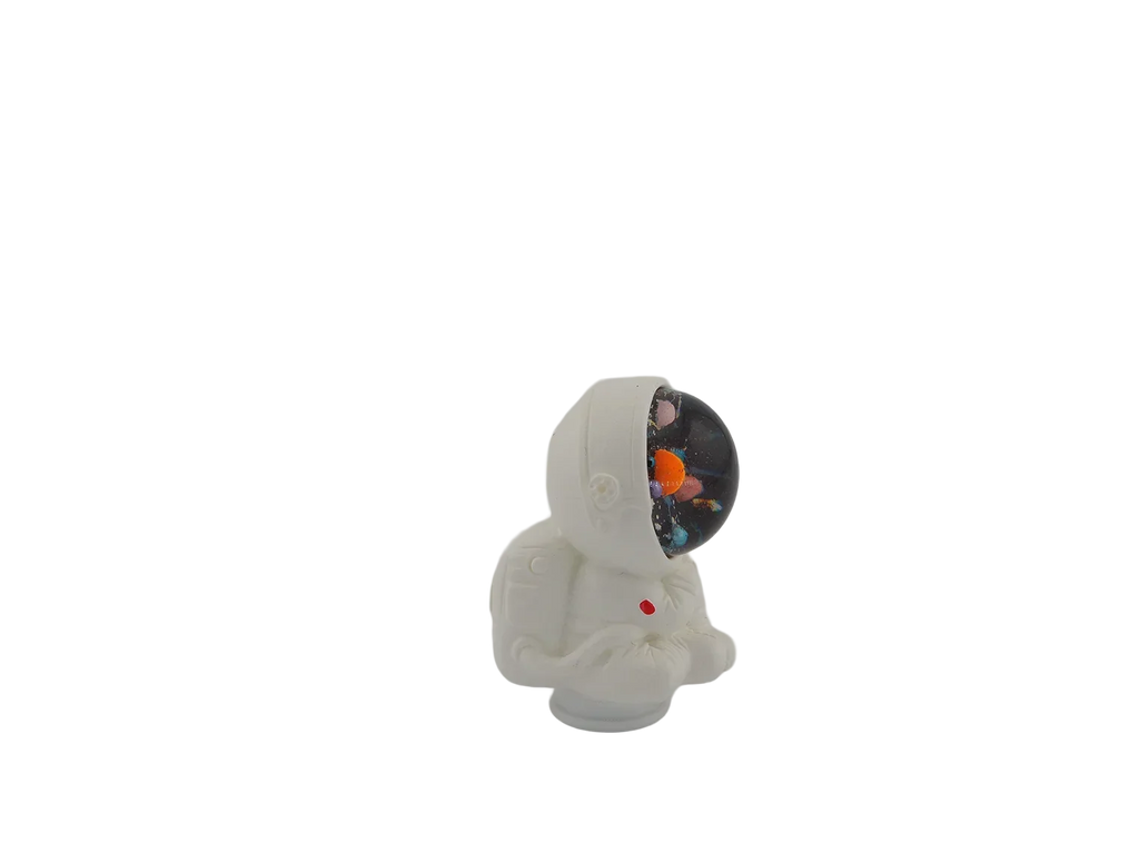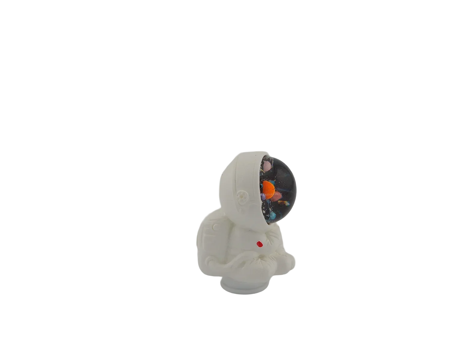 A calm astronaut resting with hands on knees. A peaceful piece that complements any cosmic theme.