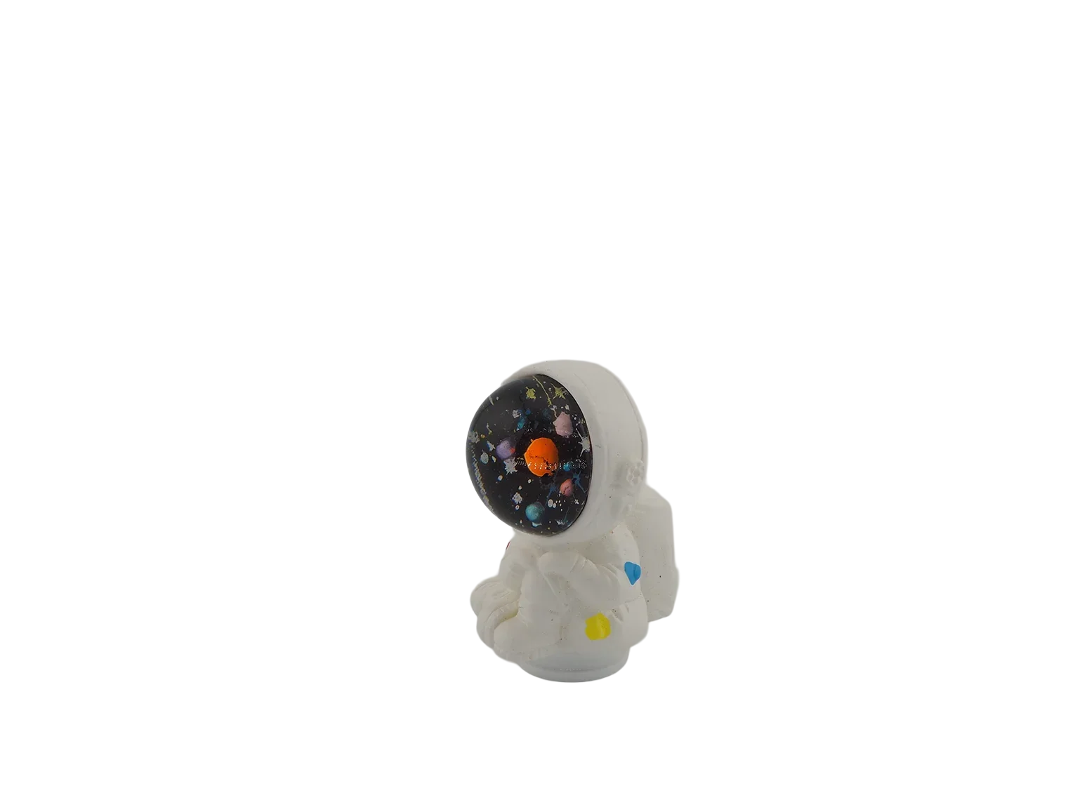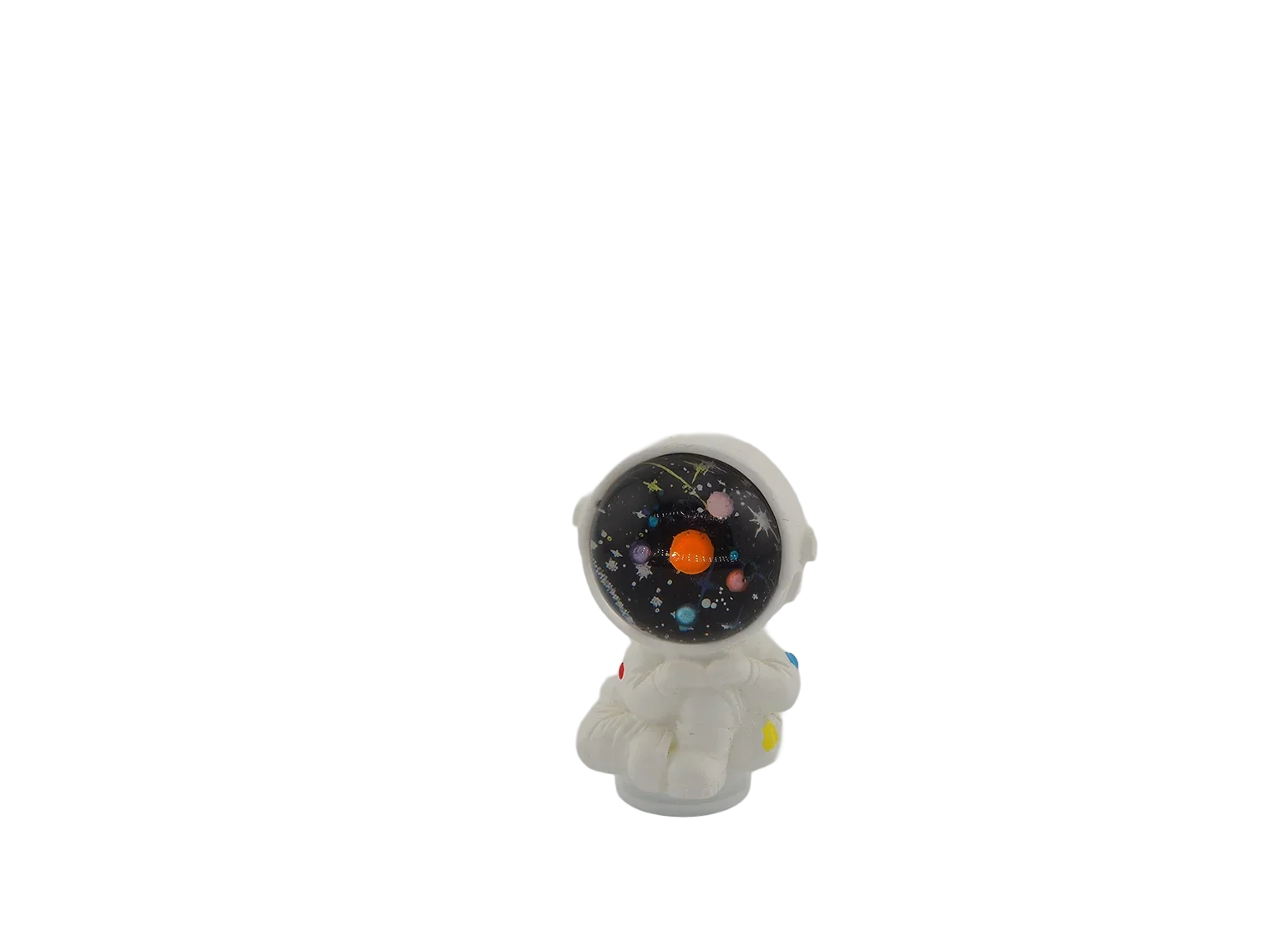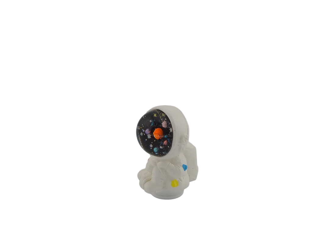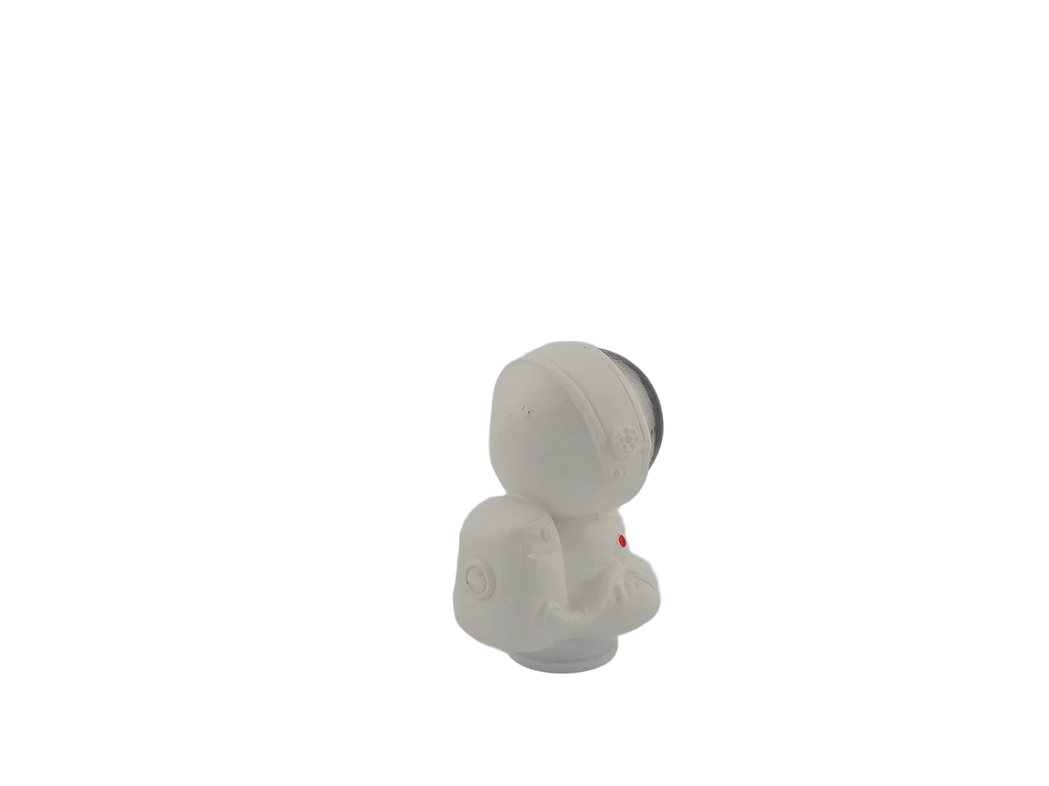 A calm astronaut resting with hands on knees. A peaceful piece that complements any cosmic theme.